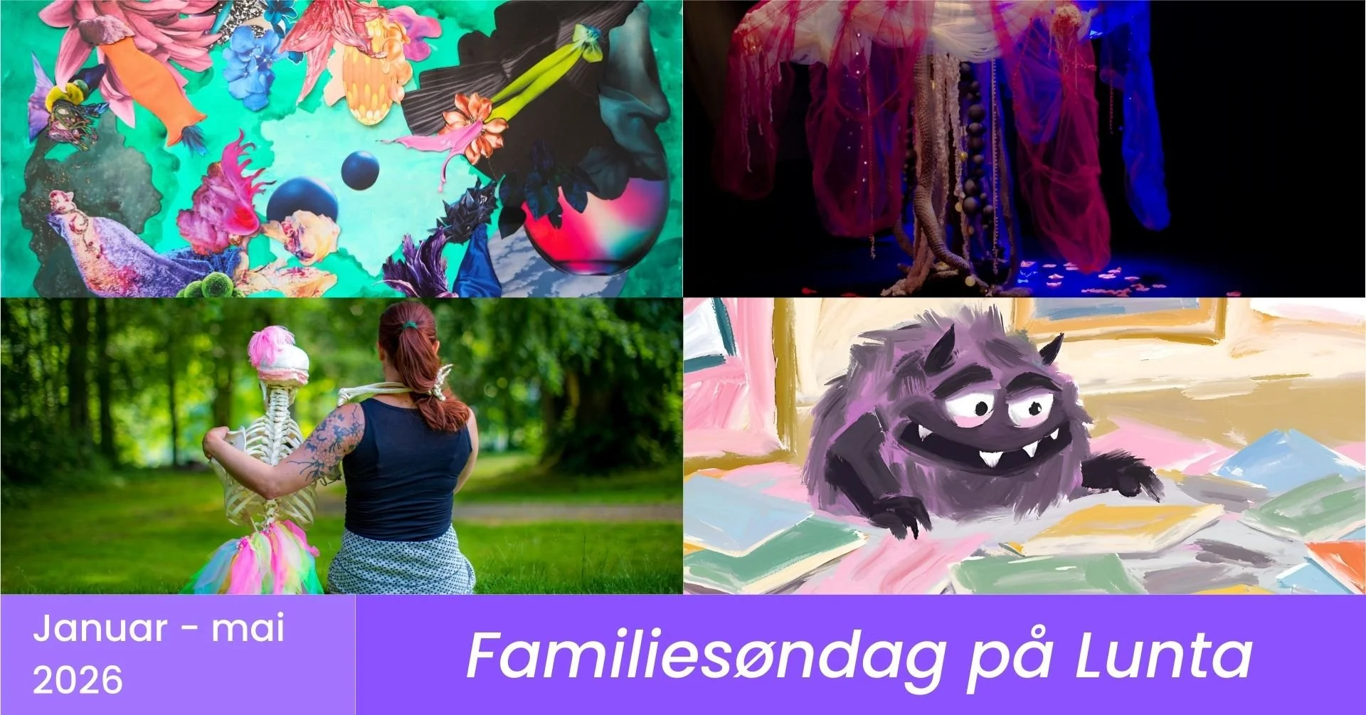 En søndag i måneden arrangerer vi familiesøndag på Studio Lunta. Følg med på Facebook for å se program. Vi har alltid åpent fra 13 - 15, med kafe og forestilling eller andre aktiviteter.